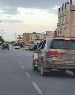 ويبدو ان السيارة كانت ممتلئة عن اخرها بركاب الاسرة الامر الذي اضطر والدها الى الإمساك بها بهذه الطريقة.