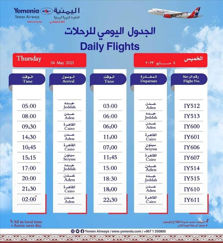 حفظ الصورة تعرف على مواعيد رحلات طيران اليمنية اليوم الخميس(صورة) الخميس ٠٤ مايو ٢٠٢٣ الساعة ١٠:٢٥ صباحاً (مجال نت)خاص: