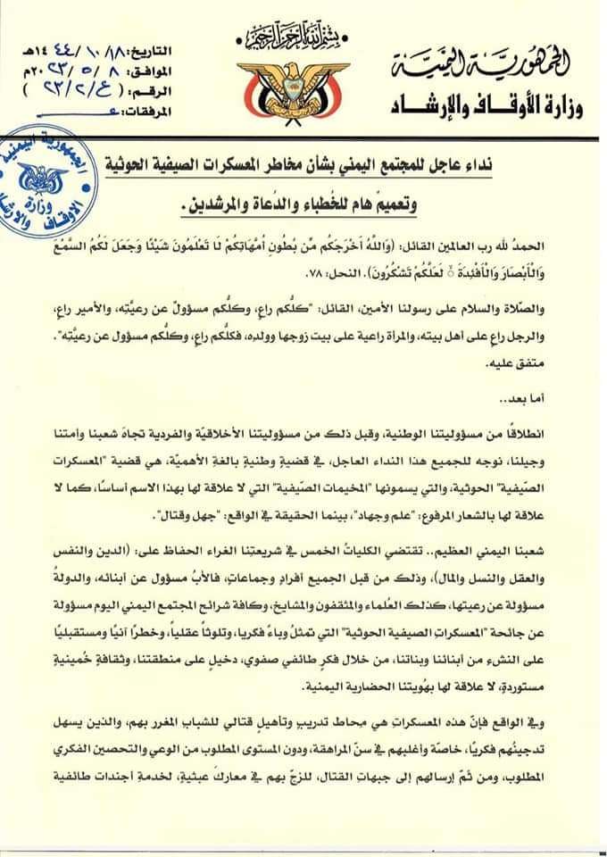 وجاء في بيان الوزارة الذي حمل النداء العاجل( انطلاقًا من مسؤوليتنا الوطنية، وقبل ذلك من مسؤوليتنا الأخلاقية والفردية تجاه شعبنا وأمتنا وجيلنا، نوجه للجميع هذا النداء العاجل ، في قضية وطنية بالغة الأهمية، هي قضية " المعسكرات الصيفية " الحوثية، والتي يسمونها " المخيمات الصيفية ") مؤكدة أن لا علاقة لها بهذا الاسم أساسا، كما لا علاقة لها بالشعار المرفوع : " علم وجهاد " ، بينما الحقيقة و الواقع : " جهل وقتال.