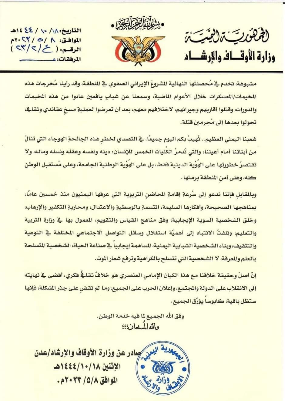 أطلقت وزارة الأوقاف والإرشاد، اليوم، بالعاصمة المؤقتة عدن، نداءً عاجلًا للمجتمع اليمني بشأن مخاطر المعسكرات الصيفية الحوثية التي تدشنها المليشيات الحوثية المدعومة إيرانيًا في عموم المحافظات الواقعة بالإكراه تحت سيطرتها كما أصدرت الوزارة تعميمًا هامًا للخطباء والدعاة والمرشدين للقيام بدورهم في كشف المخطط الصفوي الفارسي الذي تنفذه الأداة الحوثية الإرهابية في اليمن.