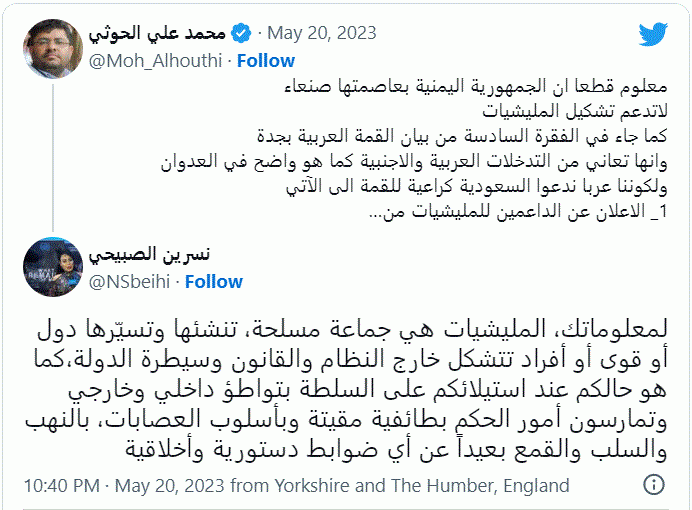 وقال الحوثي في تدوينة له على موقع"تويتر"معلوم قطعًا أن الجمهورية اليمنية بعاصمتها صنعاء لاتدعم تشكيل المليشيات كما جاء في الفقرة السادسة من بيان القمة العربية بجدة، وادعوا الاحرار ان يكتبوا اسماء المليشيات المدعومة عربيا في الوطن العربي وأسماء الدول العربية الداعمة لها".