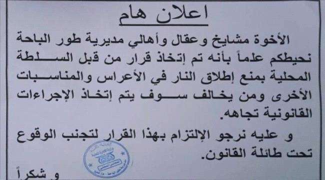 أصدرت قيادة السلطة المحلية بمديرية طورالباحة م/لحج قراراً أمنياً جديداً تمثل بمنع إطلاق الأعيرة النارية في حفلات الزفاف وغيرها من المناسبات الإحتفالية.