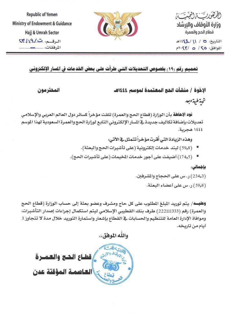 أبلغت وزارة الأوقاف في خطاب إلى منشآت الحج المعتمدة برسوم إضافية قالت إنها تعديلات بإضافة تكاليف جديدة في المسار الإلكتروني.