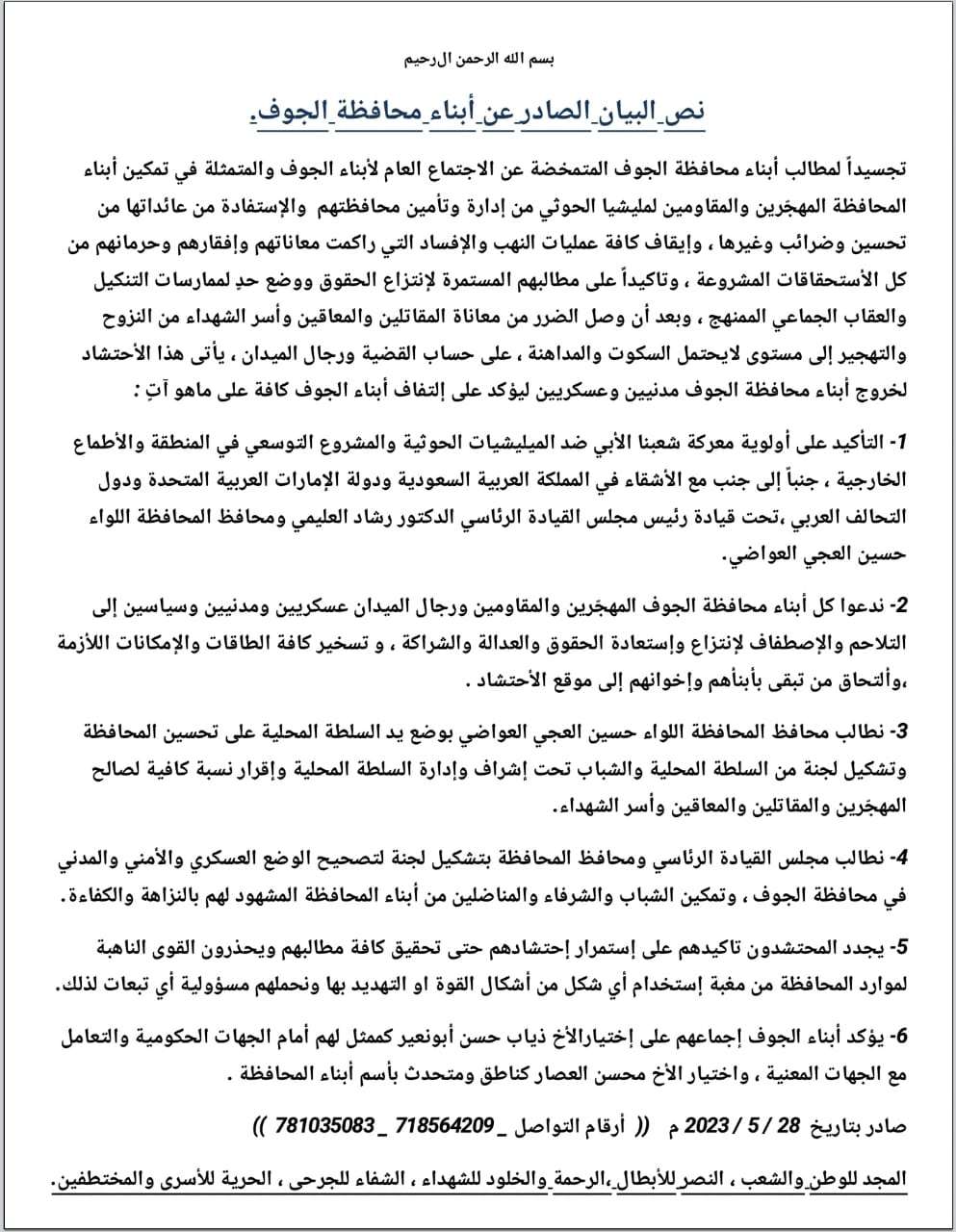 تجسيداً لمطالب أبناء محافظة الجوف المتمخضة عن الاجتماع العام لأبناء الجوف والمتمثلة في تمكين أبناء المحافظة المهجّرين والمقاومين لمليشيا الحوثي من إدارة وتأمين محافظتهم والإستفادة من عائداتها من تحسين وضرائب وغيرها ، وإيقاف كافة عمليات النهب والإفساد التي راكمت معاناتهم وإفقارهم وحرمانهم من كل الأستحقاقات المشروعة ، وتاكيداً على مطالبهم المستمرة لإنتزاع الحقوق ووضع حدٍ لممارسات التنكيل والعقاب الجماعي الممنهج ، وبعد أن وصل الضرر من معاناة المقاتلين والمعاقين وأسر الشهداء من النزوح والتهجير إلى مستوى لايحتمل السكوت والمداهنة ، على حساب القضية ورجال الميدان ، يأتى هذا الأحتشاد لخروج أبناء محافظة الجوف مدنيين وعسكريين ليؤكد على إلتفاف أبناء الجوف كافة على ماهو آتٍ :
