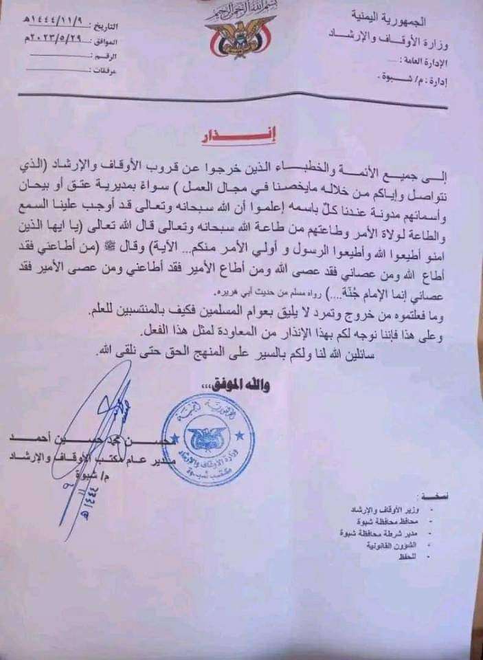 إلى جميع الأئمة والخطباء الذين خرجوا عن قروب الأوقاف والإرشاد الذي نتواصل وإياكم من خلاله ما يخصنا في مجال العمل ( سواء بمديرية عتق أو بيحان وأسمائهم مدونة عندنا كلّ باسمه إعلموا أن الله سبحانه وتعالى قد أوجب علينا السمع والطاعة لولاة الأمر وطاعتهم من طاعة الله سبحانه وتعالى قال الله تعالى (يا ايها الذين امنو أطيعوا الله وأطيعوا الرسول وأولي الأمر منكم.... (الآية) وقال (من أطاعني فقد أطاع الله ومن عصاني فقد عصى الله ومن أطاع الأمير فقد أطاعني ومن عصى الأمير فقد عصاني إنما الإمام جنّة....) رواه مسلم من حديث أبي هريره. وما فعلتموه من خروج وتمرد لا يليق بعوام المسلمين فكيف بالمنتسبين للعلم. وعلى هذا فإننا نوجه لكم بهذا الإنذار من المعاودة لمثل هذا الفعل. سائلين الله لنا ولكم بالسير على المنهج الحق حتى تلقى الله.