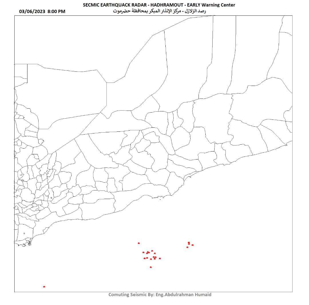سجل مرصد الزلازل بمدينة المكلا المرتبط بشبكة محطات السيزميك العالمي منذ صباح يوم السبت الموافق 2023/06/03م حوالي (20) هزة زلزالية بحرية حتى الساعة 8:00 من مساء السبت ، تمركزت معظم بؤر الهزات الزلزالية البحرية في عمق خليج عدن المقابل لمحافظات حضرموت وشبوة وأبين ، تراوحت شدتها بين (4.4) إلى (6) درجات على مقياس ريختر ، تصنف معياريا كهزات بين المتوسطة إلى القوية .
