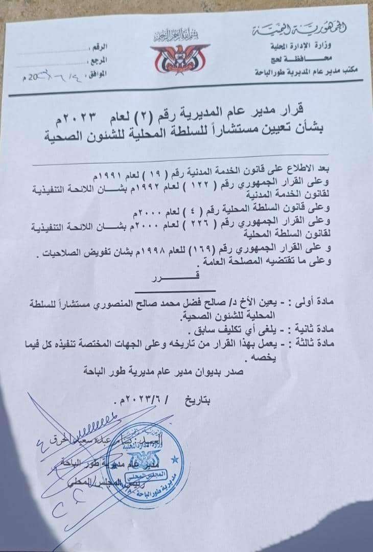 وقضى القرار في مادته الأولى بتعيين (( صالح فضل محمد صالح المنصوري)) مستشارا" للسلطة المحلية لشئون الصحة في مديرية طور الباحة محافظة /لحج