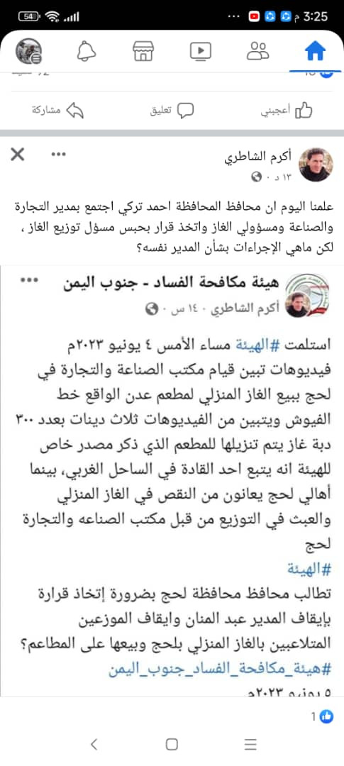 وكان الناشط اكرم الشاطري قال في منشور له أن توجيهات صدرت من محافظ لحج اللواء احمد التركي بحبس مسؤول توزيع الغاز، متسائلا عن الإجراءات التي تستخذ بحق مدير التجارة والصناعة بالمحافظة المسؤول عنه.