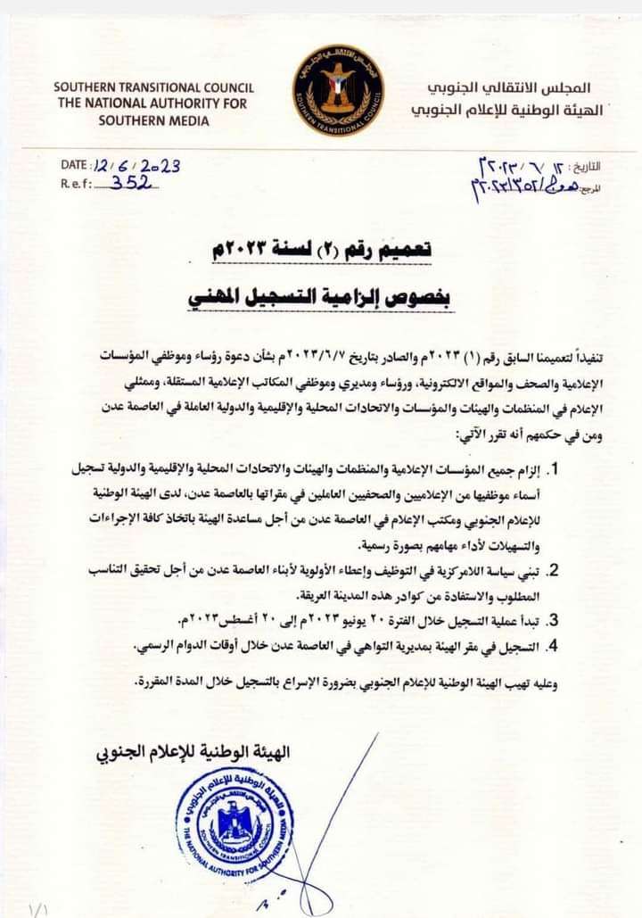 تنفيذاً لتعميمنا السابق رقم (1) 2023م والصادر بتاريخ 7/6/2023م بشأن دعوة رؤساء وموظفي المؤسسات الإعلامية والصحف والمواقع الالكترونية، ورؤساء ومديري وموظفي المكاتب الإعلامية المستقلة، وممثلي الإعلام في المنظمات والهيئات والمؤسسات والاتحادات المحلية والإقليمية والدولية العاملة في العاصمة عدن ومن في حكمهم أنه تقرر الآتي:
