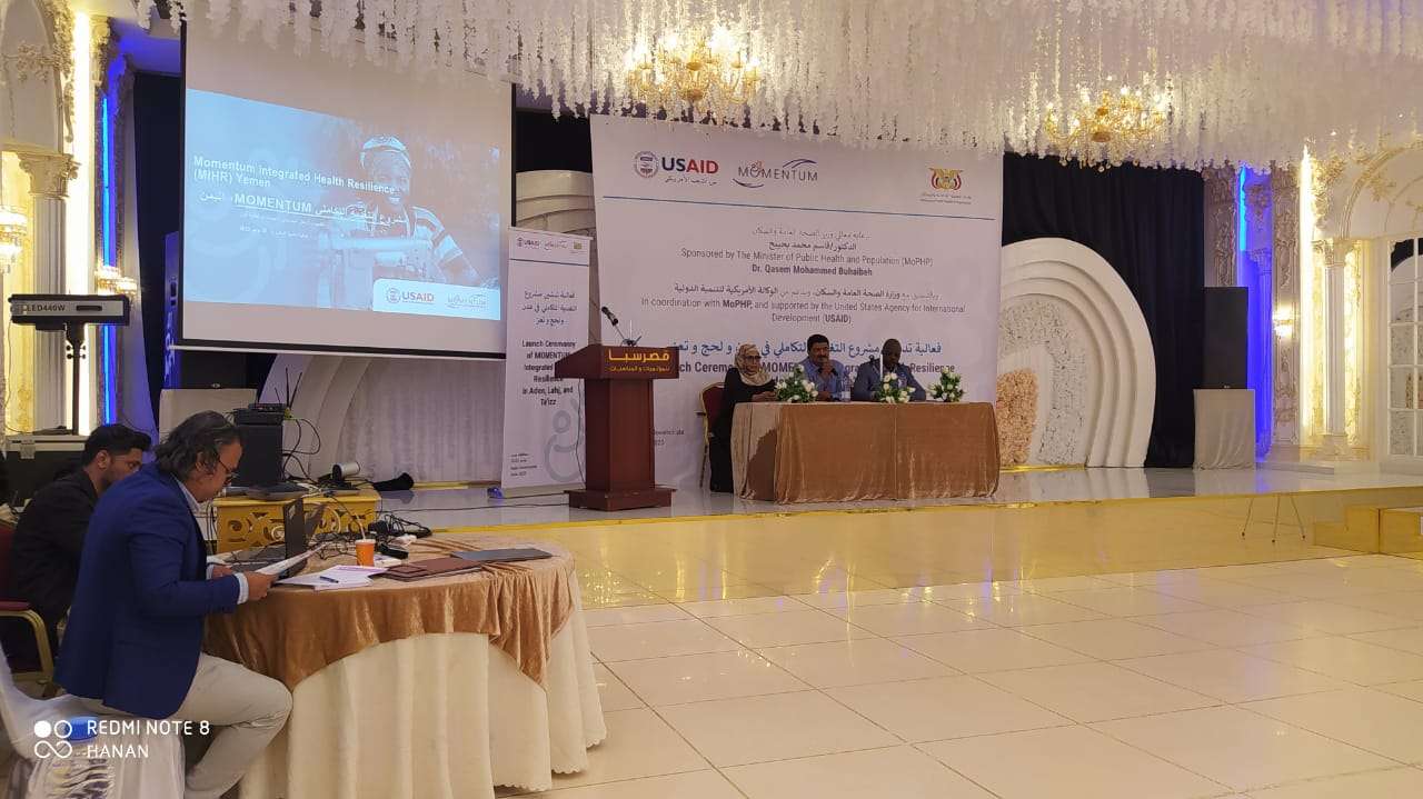 افتتحا صباح اليوم الدكتورة اشراق السباعي وكيل المساعد لوكيل قطاع السكان بوزارة الصحة العامة والسكان والدكتور محمد مصطفى راجمنار مدير عام الإدارة العامة لصحة الأسرة بوزارة الصحة العامة والسكان فعالية تدشين مشروع التغذية التكاملي في عدن ولحج وتعز وذلك برعاية معالي وزير الصحة العامة والسكان أ.د قاسم محمد بحيبح بالتنسيق مع وزارة الصحة العامة والسكان وبدعم من الوكالة الأمريكية للتنمية الدولية وبحضور مدير منظمة جون سنو أريك وممثلين عن مكاتب الصحة في المحافظات المستهدفة للمشروع